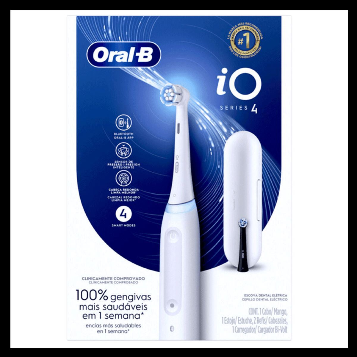 A melhor limpeza da Oral-B com a revolucionária tecnologia magnética iO: clinicamente comprovada, 100% dentes mais saudáveis em 1 semana, comparado com escova manual. O i04 te guia para uma limpeza perfeita. Com treinamento personalizado em tempo real. O aplicativo que o acompanha mostra seu relatório diário de escovação. Com 4 modos de escovação, a Oral-B está ao seu lado para suas tarefas diárias de escovação. Com sua cabeça redonda e microvibrações, gera um movimento suave e harmônico através de uma ação de limpeza sincronizada (microvibrações sincronizadas com oscilações). Um temporizador de 2 minutos incorporado garante uma experiência ainda mais fácil, ajudando você a obter uma limpeza ótima em todos os seus dentes. O temporizador de quadrante da Oral-B divide os dois minutos em quatro intervalos de 30 segundos para limpar cada quadrante da boca; nós contamos o tempo para você, então você não precisa fazê-lo. O sensor de pressão indica a pressão de limpeza ideal e avisa sobre pressão excessiva. Com uma capa de viagem incluída, você terá uma limpeza fresca onde quer que vá. Estamos com você em sua próxima viagem ou mesmo em sua escovação de tarde em movimento! O melhor de tudo é que a Oral-B traz para você, a marca número 1 recomendada por dentistas em todo o mundo